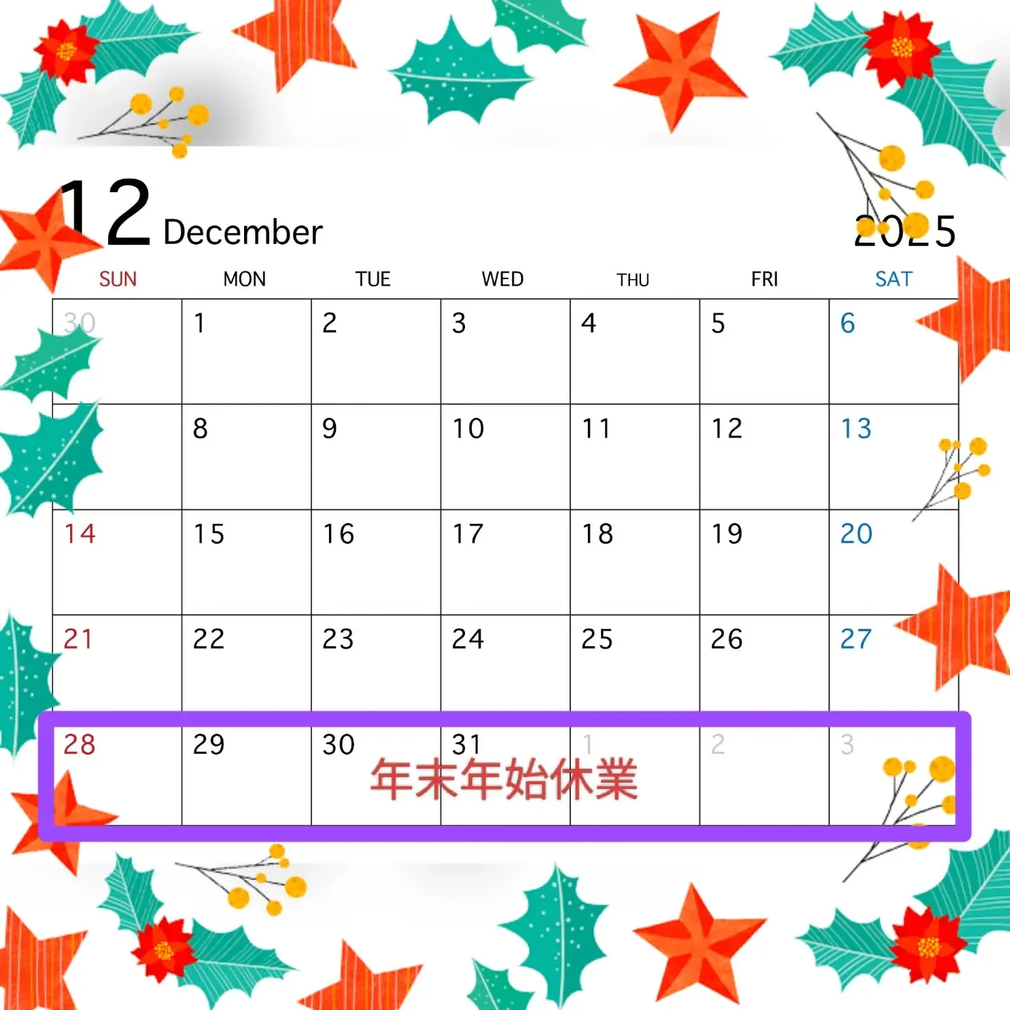 🎍年末年始の休業期間について🎍 2025/12/18 🎍年末年始の休業期間について🎍 いつも当店をご利用頂きまして、誠にありがとうございます。 今年の年末年始休業につきましては、 令和7年12月28日〜令和8年1月3日まで といたします。 何卒ご利用のほど、よろしくお願いいたします。